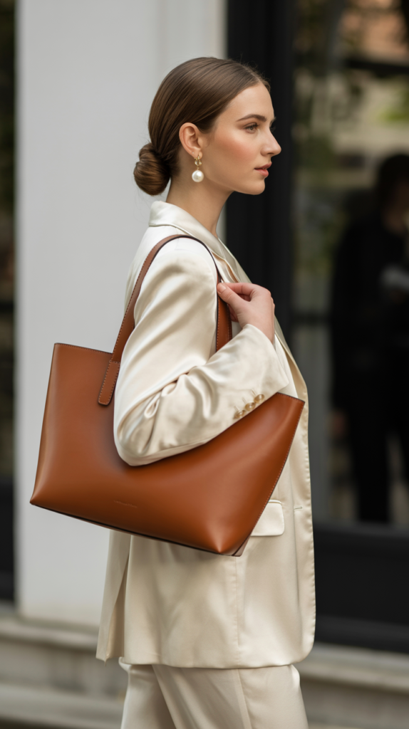 - Structured leather bag: Medium size, top handle or shoulder strap, minimal branding.