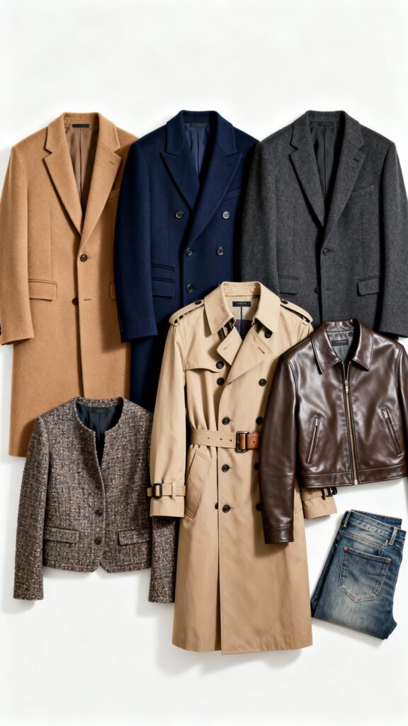 - Wool-cashmere overcoat: Camel, navy, or charcoal. Single-breasted for modern, double for drama that still reads quiet.