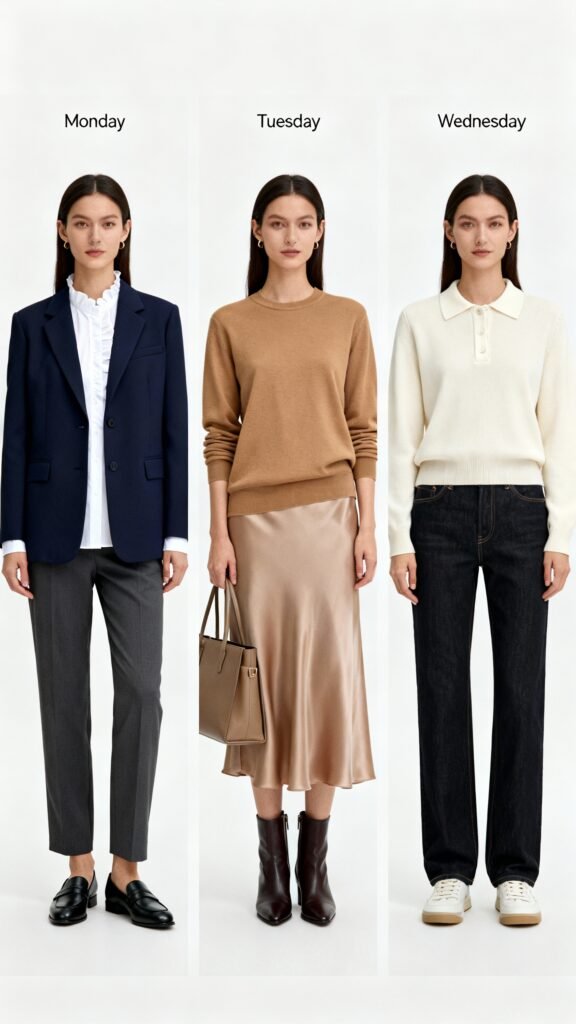 - Color discipline: Stick to neutrals (black, navy, taupe, cream, olive). Add one accent color you adore.