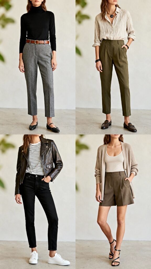 - Slim-straight trousers over ultra-wides: A mid-rise, straight leg in wool or drapey twill flatters most bodies and boots/sneakers equally.