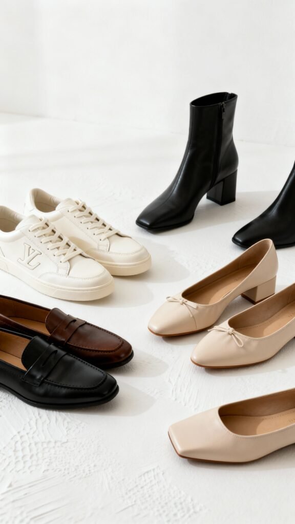 - Loafers and ballet flats: Penny loafers in black or chocolate; square-toe or almond ballet flats in soft leather.