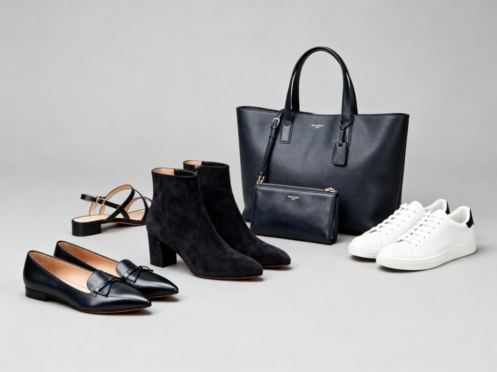 - Shoes: Pointed flats, loafers, sleek ankle boots, strappy heels (mid-height), and clean white sneakers.Leather or suede. No loud hardware.