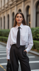 Think black tie, oversized white blouse, and tailored high-waist trousers.