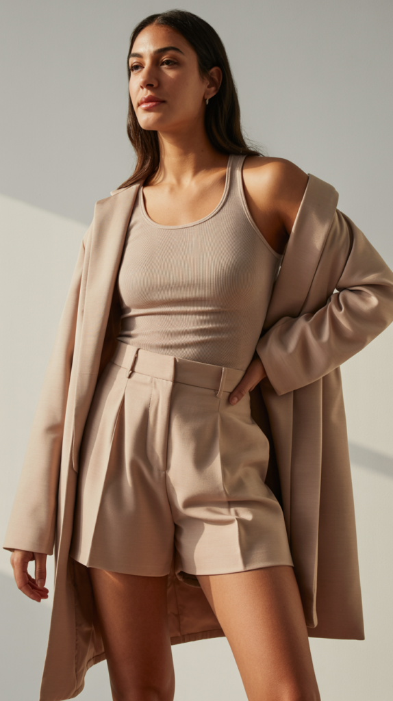 - Tank + tailored shorts + coatigan for shoulder-season glam.