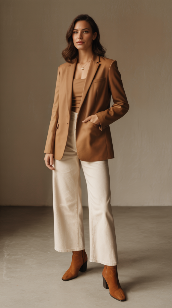 - Go tonal: tan blazer + cream jeans + suede boots = chef’s kiss.