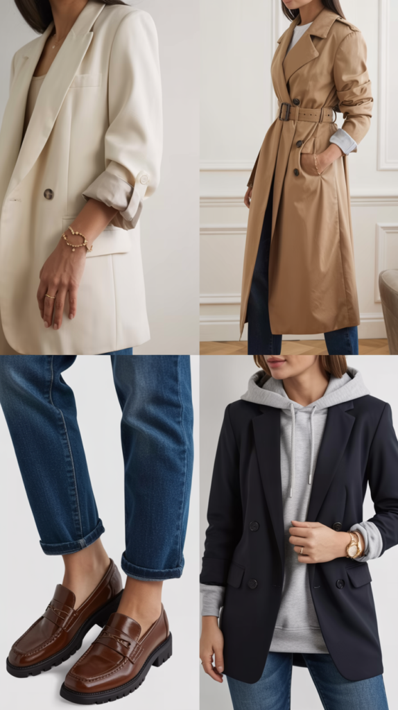 - Polished + Sporty + Cozy: Blazer, bomber, quilted liner.