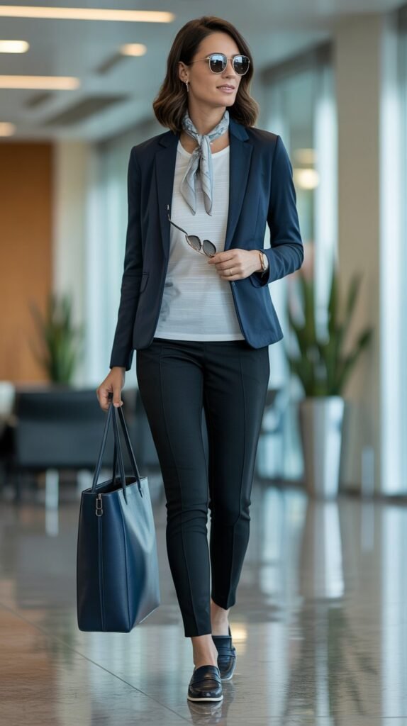 Travel days shouldn’t sacrifice polish. This outfit focuses on wrinkle-resistant fabrics and smart layers. You’ll deplane ready to lead a meeting, not hunt an iron.