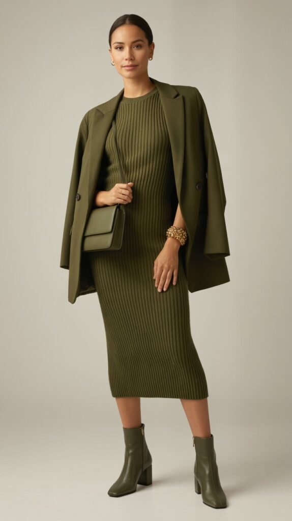 Choose rich fabrics—think merino, cashmere blends, crepe—to avoid flatness. Keep hemlines clean and the blazer unbuttoned to create a sleek column. If your dress clings, layer a lightweight slip underneath for a flawless drape.