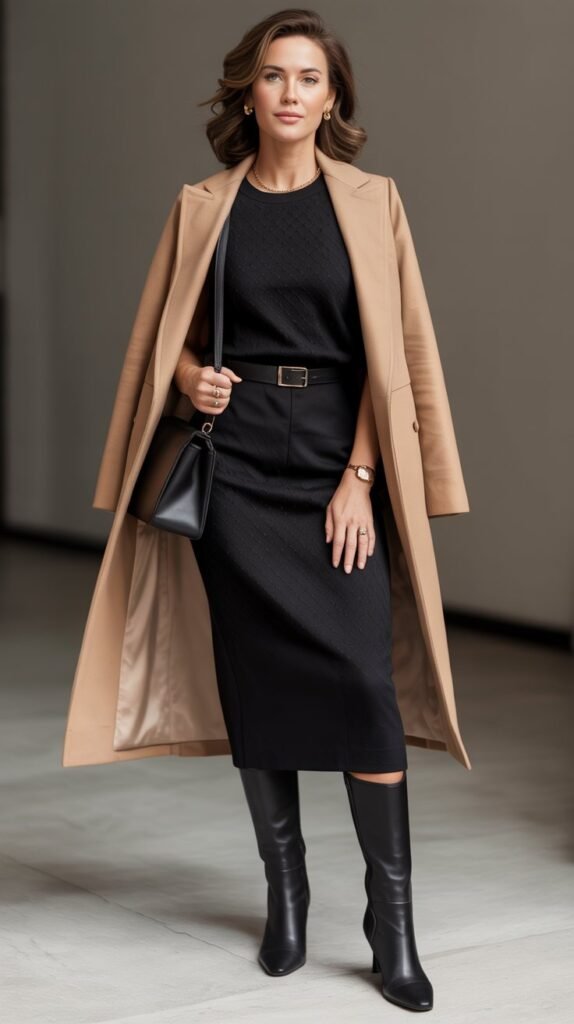 Choose a medium-weight knit that skims, not clings. Belt at the natural waist for structure, and let the coat hang open to keep the column shape. Add sheer black tights for extra polish in cooler months.
