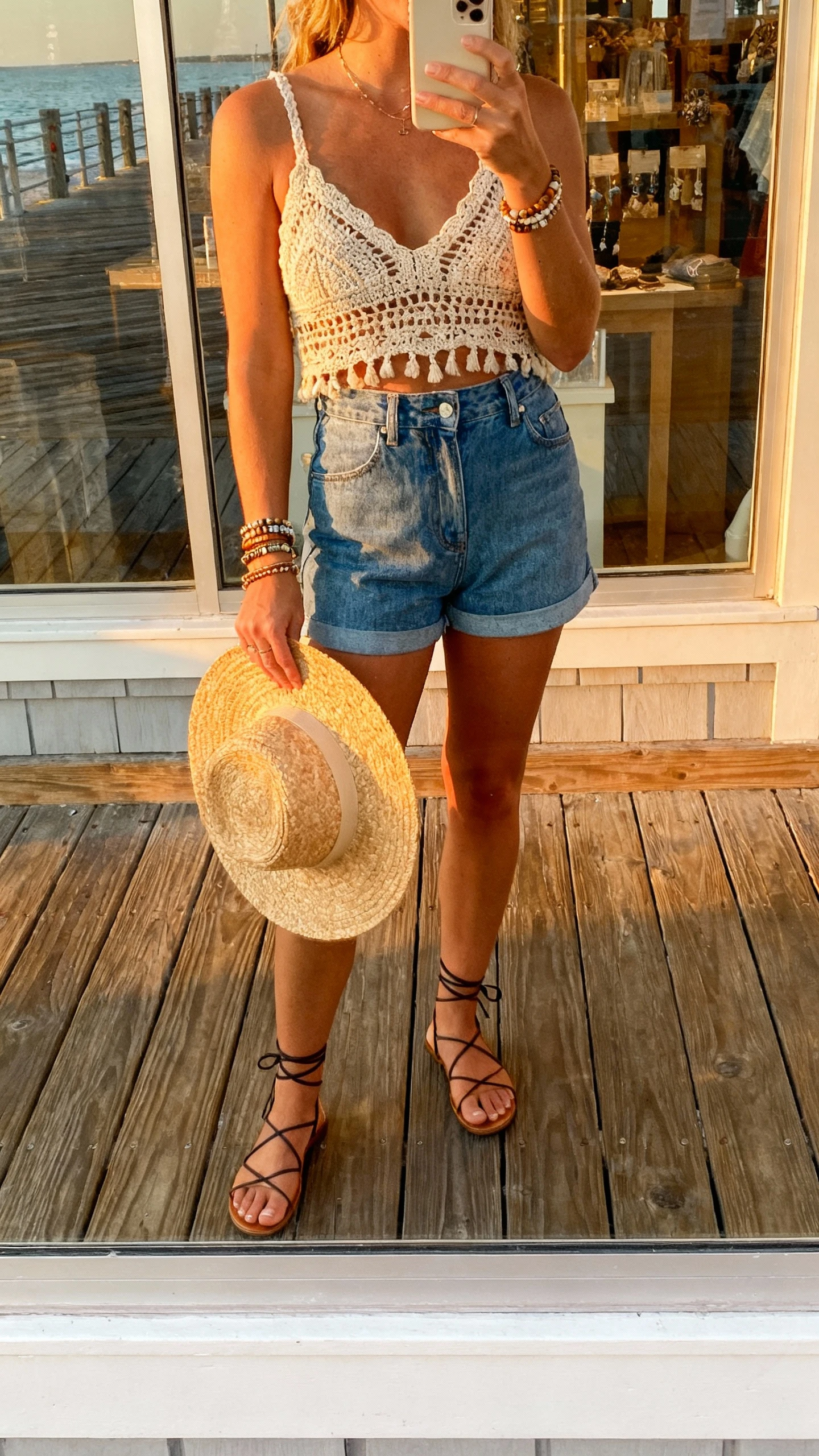 Perfect for boardwalks, beach bonfires, and daytime concerts. If you prefer more coverage, swap the crochet for a lace-trim camisole and keep the accessories boho. Add a kimono for floaty movement that looks gorgeous in photos.