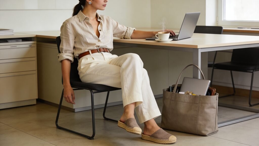 Comfort doesn’t have to look sloppy. Linen trousers with espadrille mules feel effortless but telegraph taste. It’s the chic answer to “I want to look put-together with zero effort.”