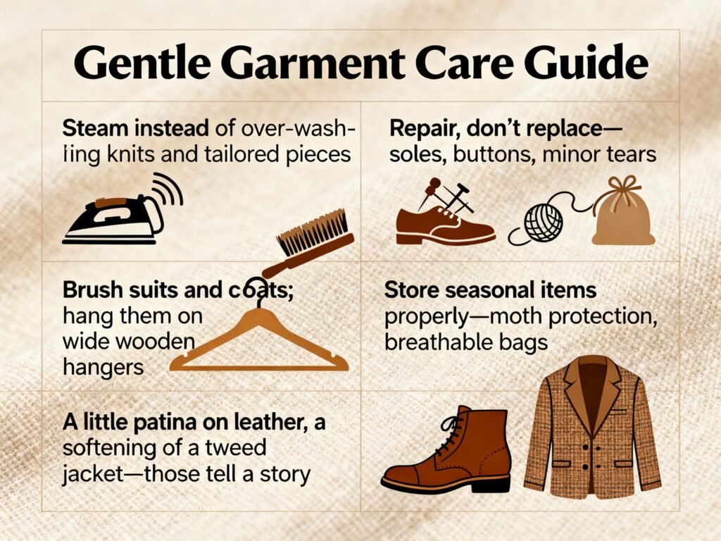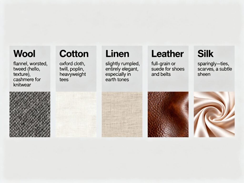 - Silk: sparingly—ties, scarves, a subtle sheen