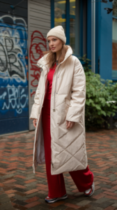 Think sleek black or beige puffers, not the kind that makes you look like a marshmallow. Unless that’s the vibe—then go for it.