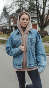 For days when you’re keeping it casual, a denim jacket layered over a hoodie with leggings and sneakers is the move.