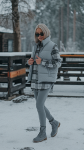 If you’re exploring outdoors or doing a day trip, this combo is both warm and very “country casual.” A flannel shirtlayered under a puffer vest with jeans is peak cozy.