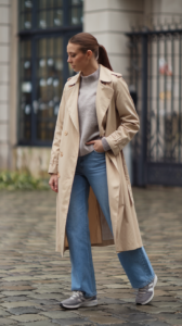 12. Trench Coat + Sweater + Straight-Leg Jeans