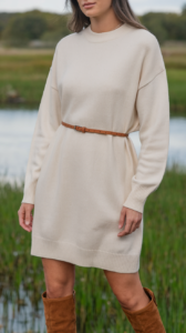 The sweater dress is basically winter’s answer to “I don’t know what to wear.” Add a belt at the waist and knee-high boots, and suddenly it looks like you planned your outfit.