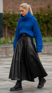 Mix cozy with edgy by pairing a chunky knit sweater with a flowy maxi skirt and combat boots.