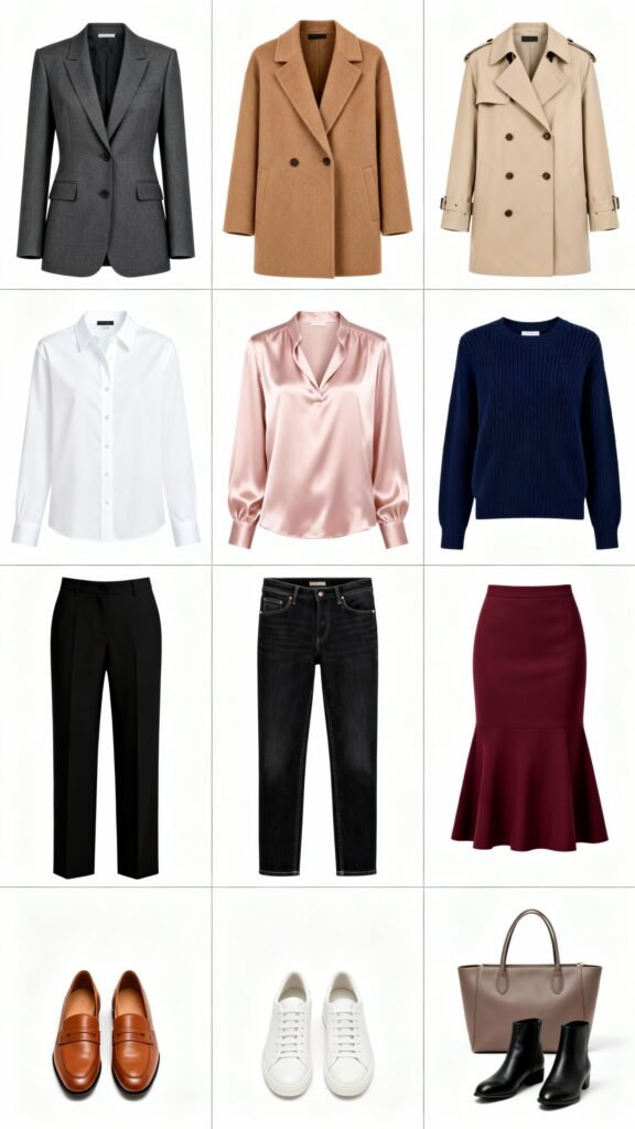 - Outer: Tailored blazer, wool coat, minimal trench.
