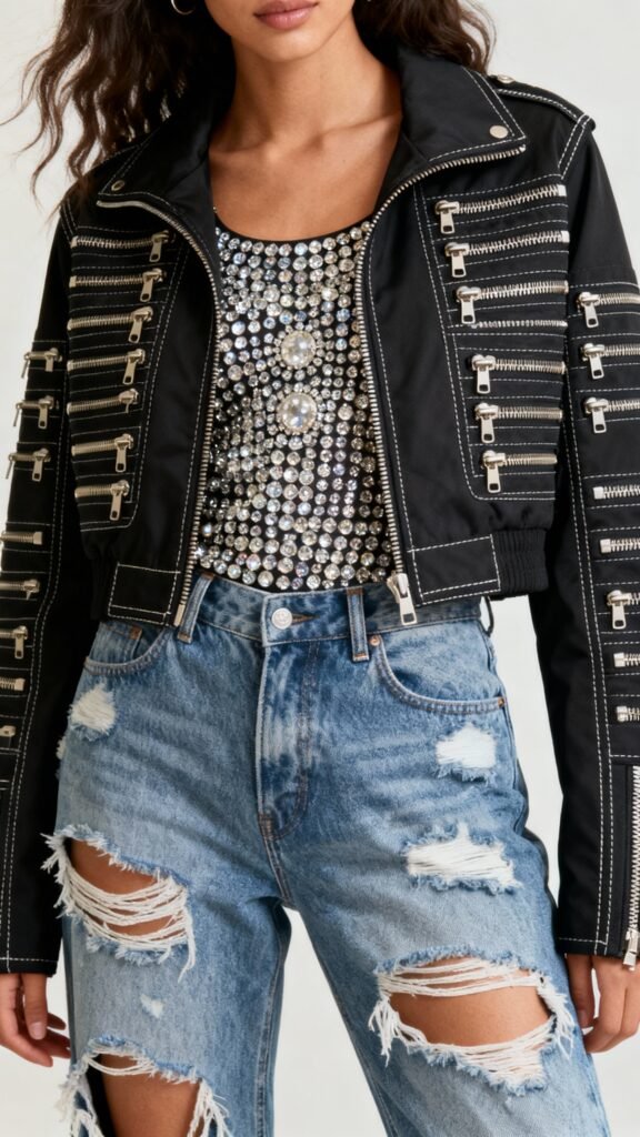 - Move out: Distressed denim covered in rips, heavily embellished tops, jackets with 19 zippers.