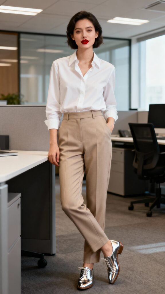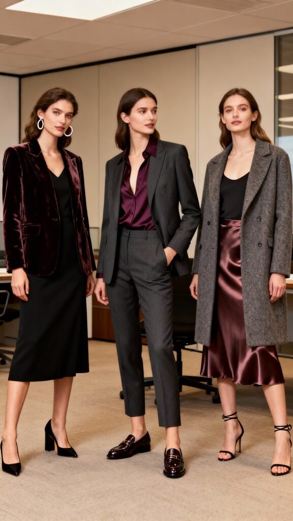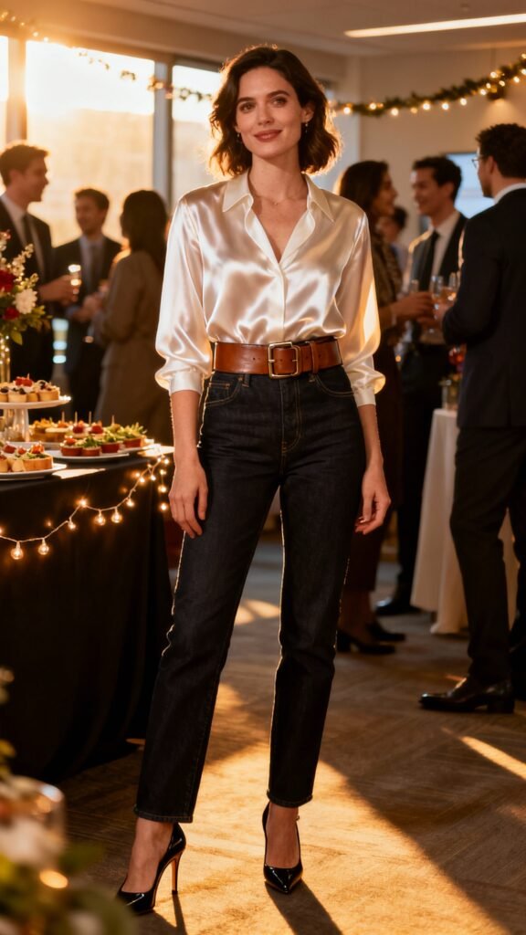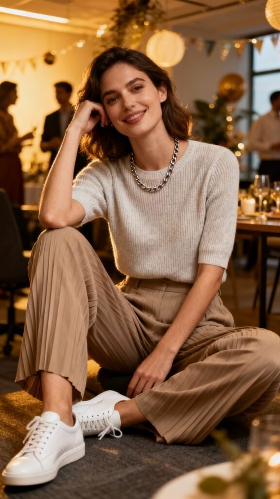 - Base: work (tailored trousers, crisp shirt) + two party accents (bold lip, metallic shoe).