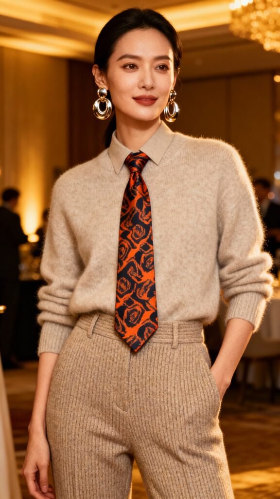 - business casual with a festive accent (statement earrings, patterned tie, luxe knit).