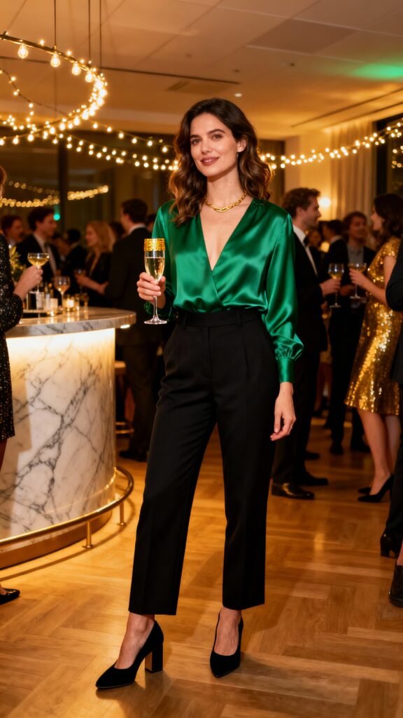 Use rich textures and colors instead: velvet, satin, suede, and jewel tones. Add metal accents in hardware—belt buckle, watch, chain. A deep green blouse with black trousers reads festive without a single sequin, IMO.