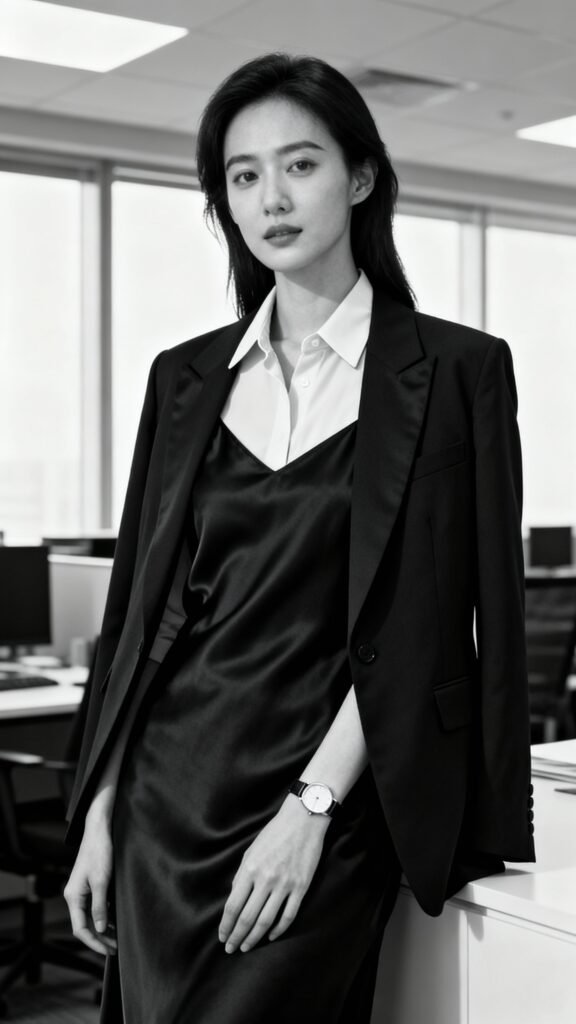 - Base: party (silk slip dress, camp-collar shirt) + two work anchors (structured blazer, minimal watch).