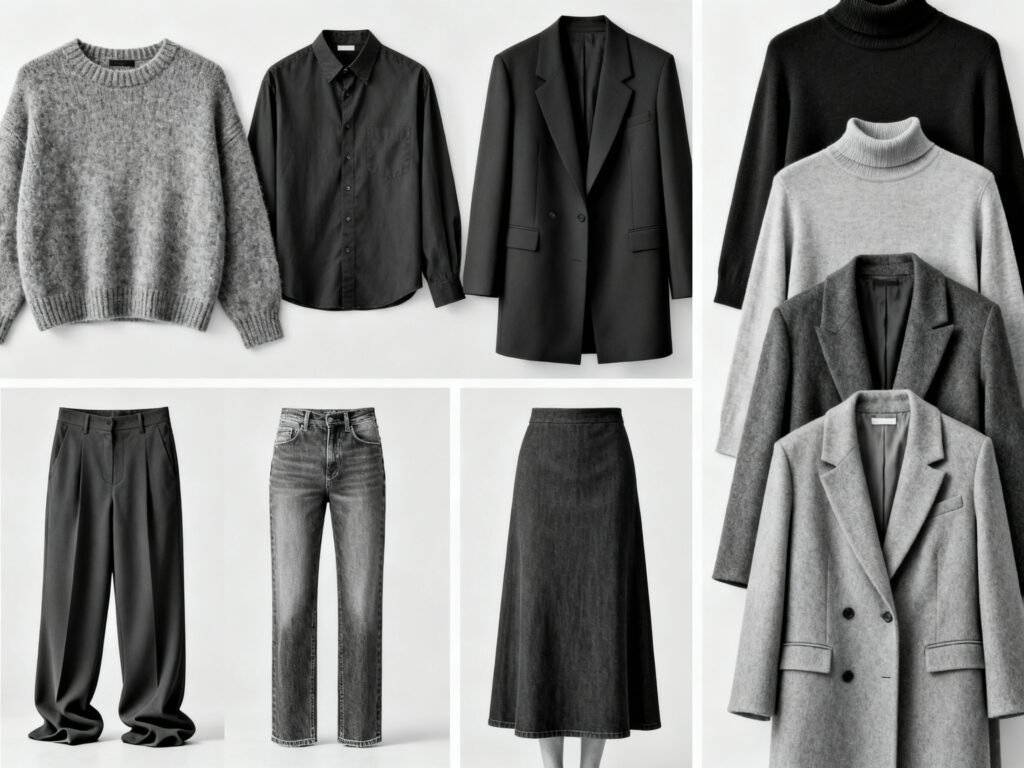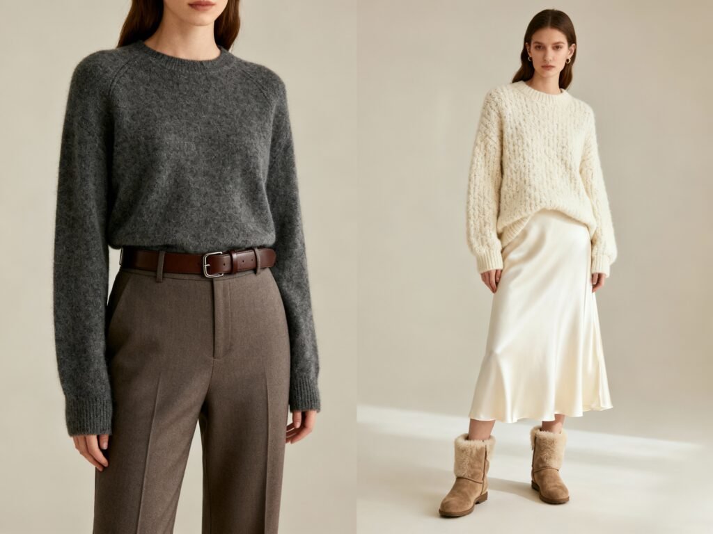 - Example: Charcoal cashmere knit + smooth wool trousers + matte leather belt.