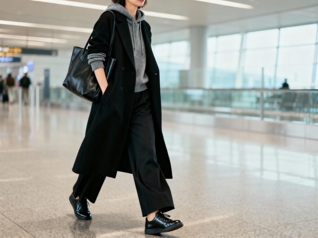 - Long black coat + grey cashmere hoodie + wide-leg trousers + leather sneakers.