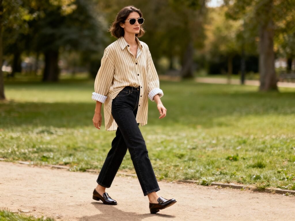 - Oversized striped button-down + straight dark denim + sleek loafers + oversized sunnies.