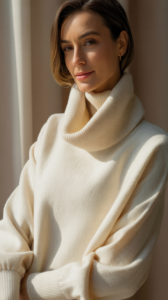 - Ignoring posture: Roll your shoulders back. A turtleneck frames your neck—slouching doubles the fabric and the frump.
