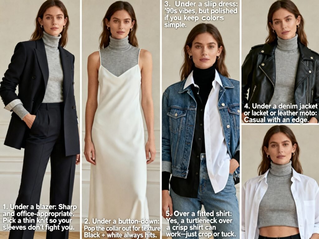 - Over a fitted shirt: Yes, a turtleneck over a crisp shirt can work—just crop or tuck.
