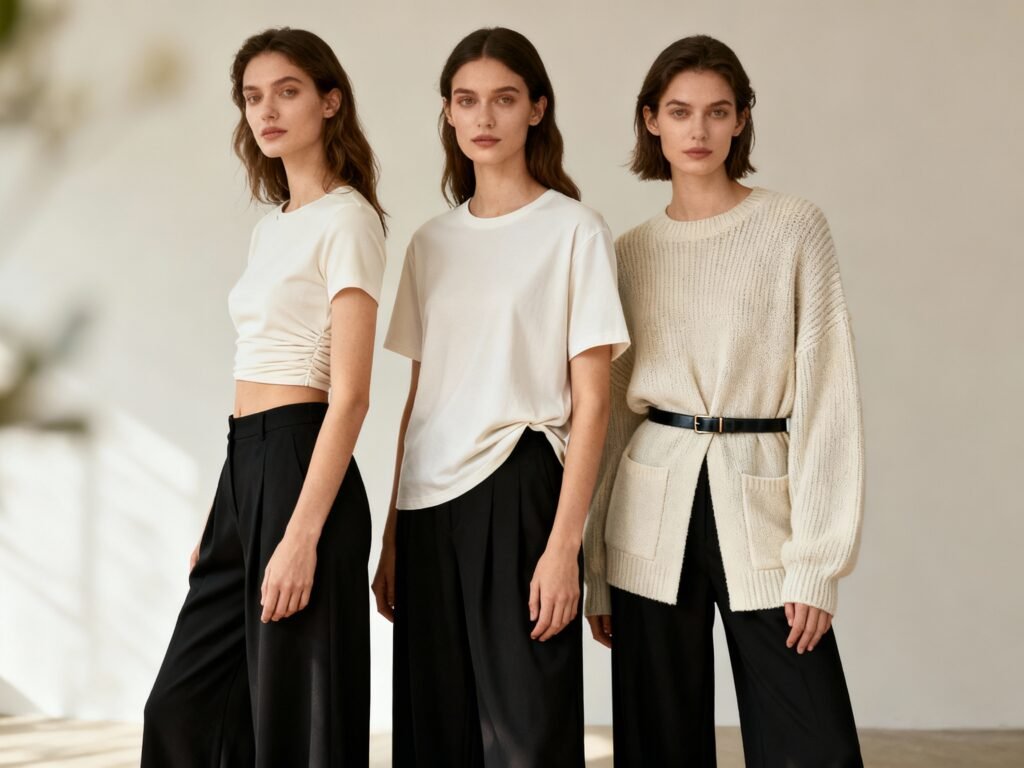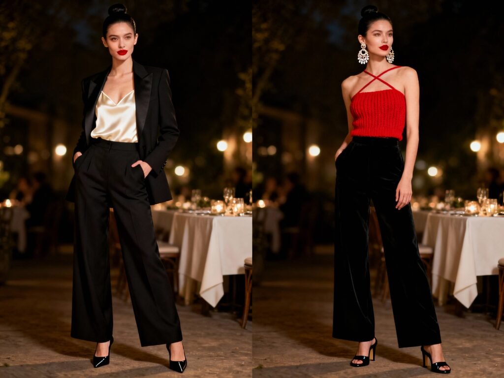 Silk camis, one-shoulder knits, or fitted bodysuits look incredible with wide legs. Layer a tuxedo-style blazer or a sleek wrap jacket, and finish with a pointed heel for that effortless, “I might own an art gallery” energy.