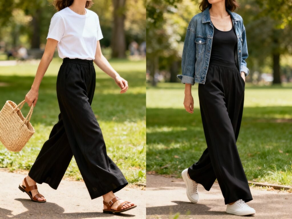 Wide-leg black pants are that friend who never tries too hard—because they don’t need to.