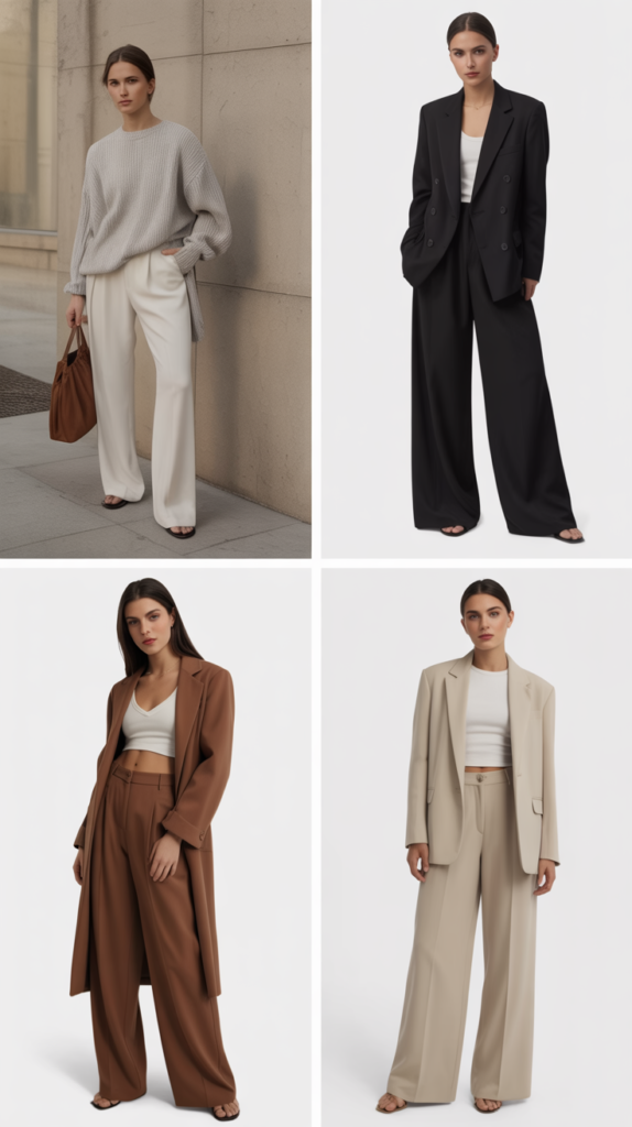 - Tailored top + fluid bottom (fitted blazer + wide-leg drape).
