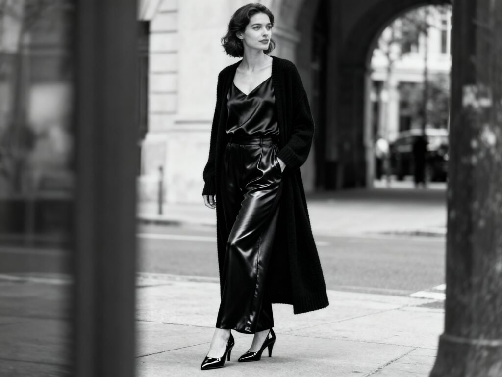 All black can feel flat—unless you play with texture. Mixing a matte pant with a silky top or a fine knit adds depth, not drama.