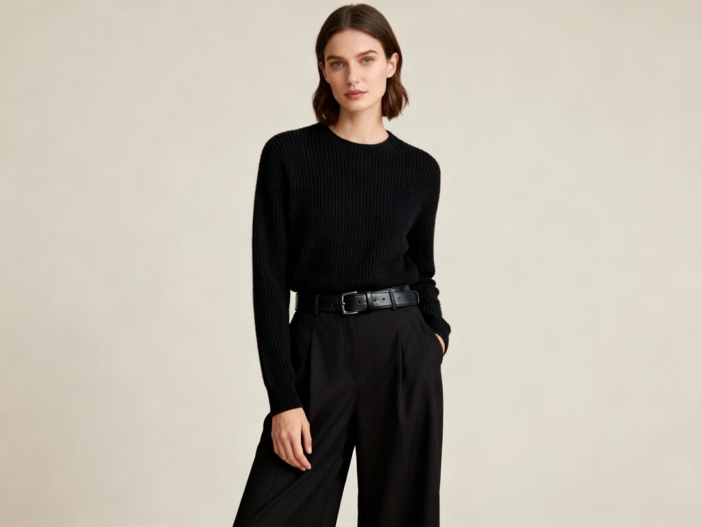 A fine-knit sweater with wide-leg black pants reads effortless luxury. Balance bulk and softness, and your silhouette stays clean.
