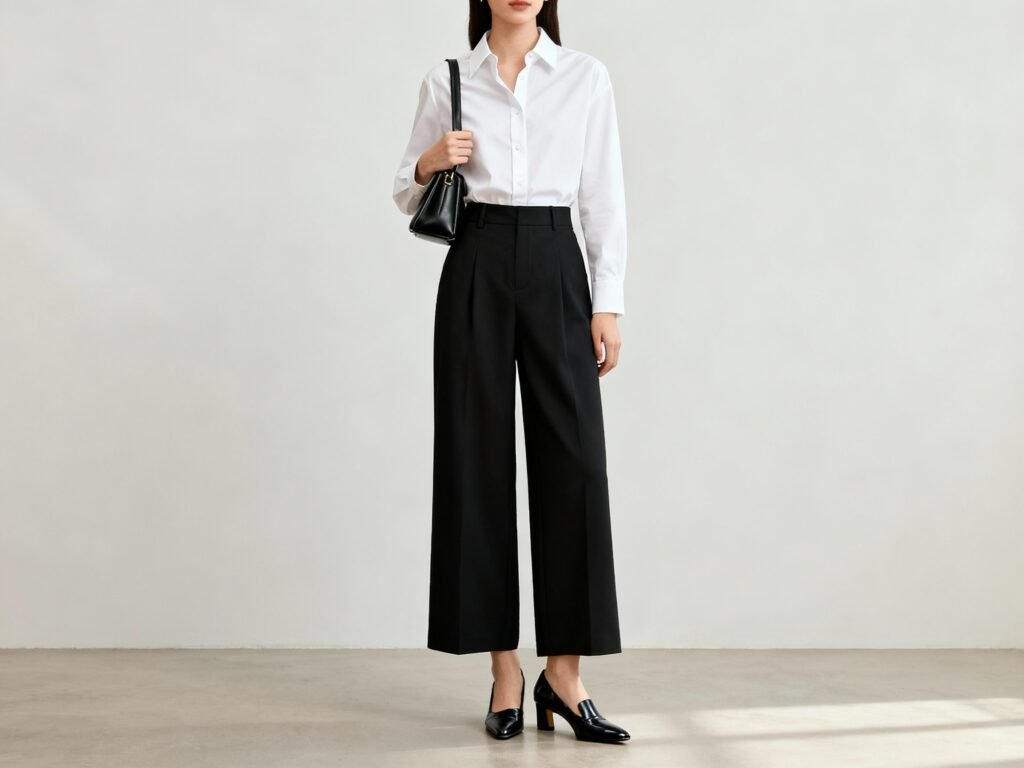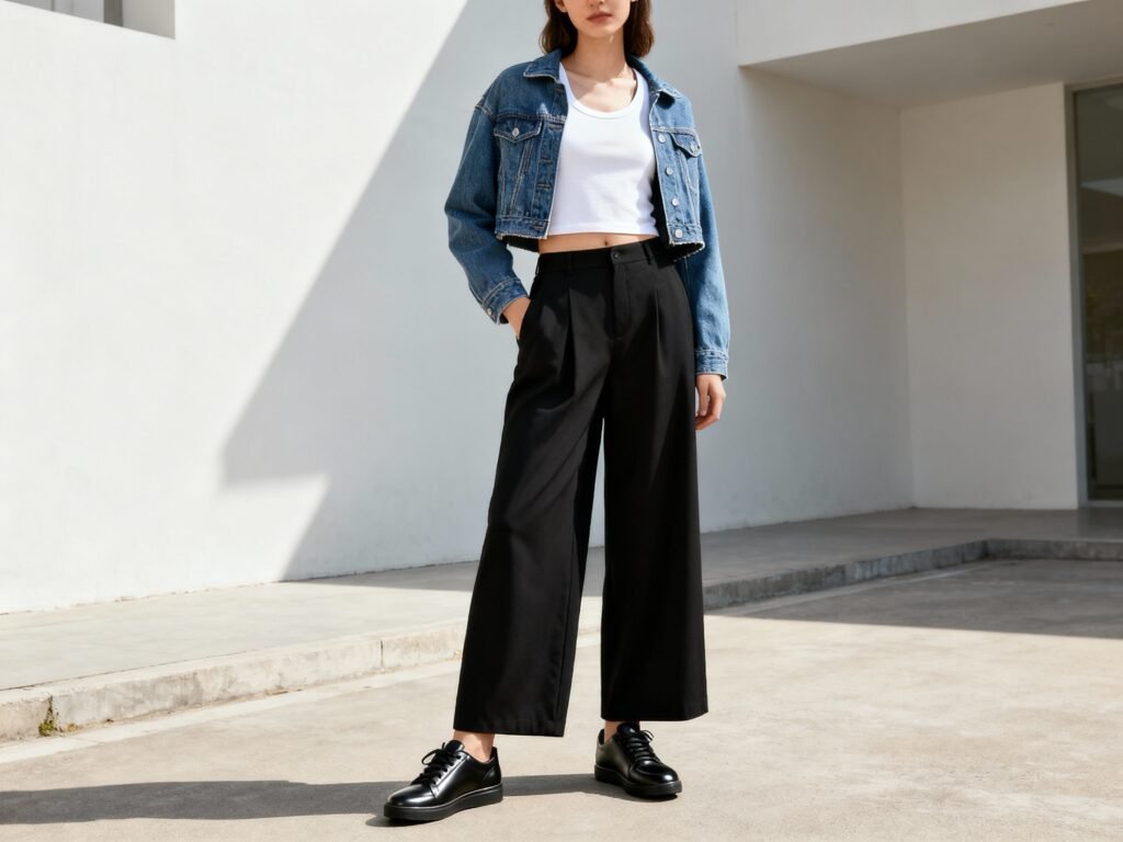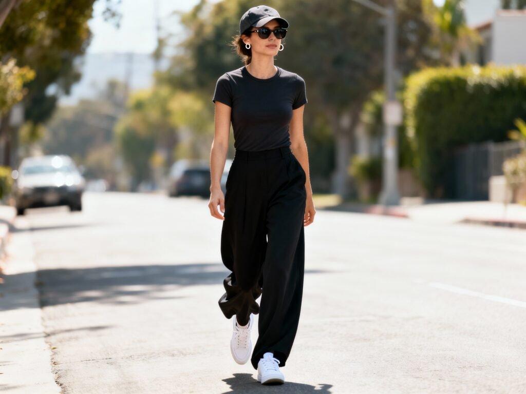 Wide-leg black pants do the heavy lifting. They lengthen your legs, sharpen your silhouette, and somehow make even a plain tee look intentional. When you nail the pairing, they scream “I have my life together” without trying.
