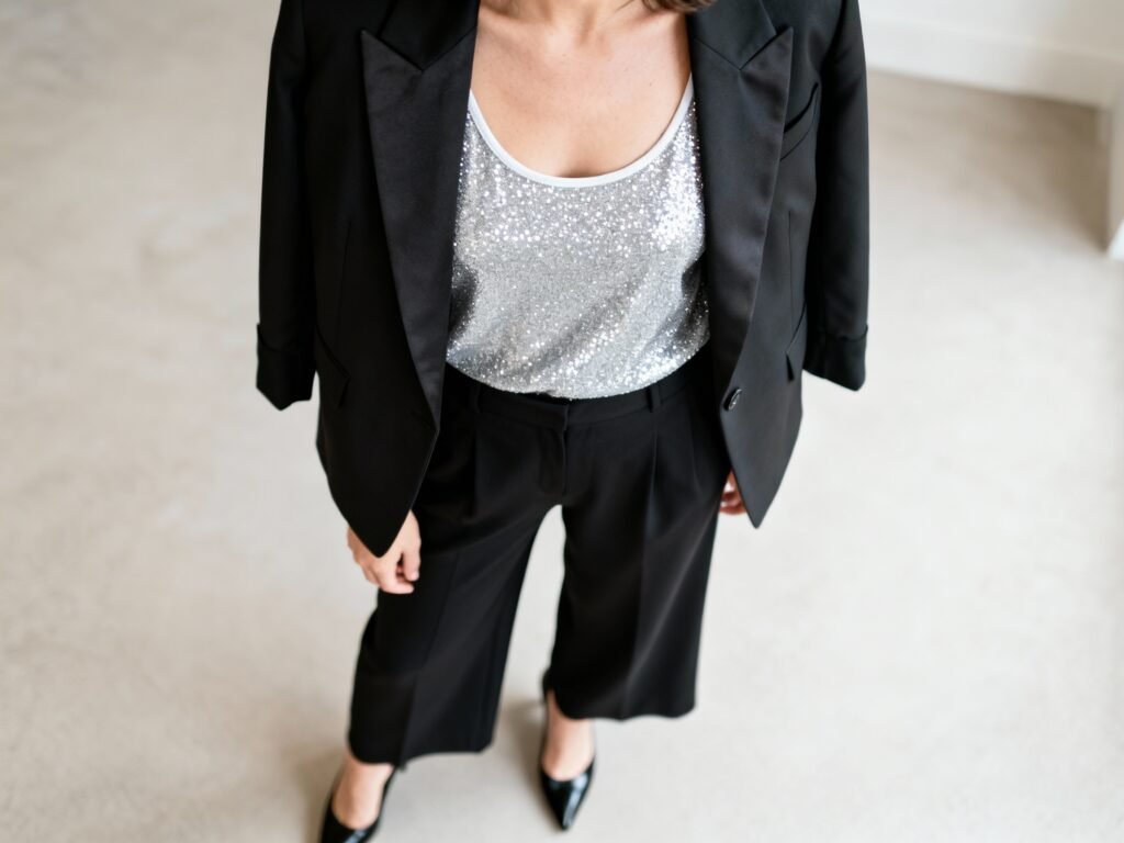 - Top ideas: One-shoulder blouse, satin wrap top, or a sparkly tank layered under a blazer.