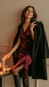 - Dinner Date: Velvet dress + heeled boots + tailored coat.