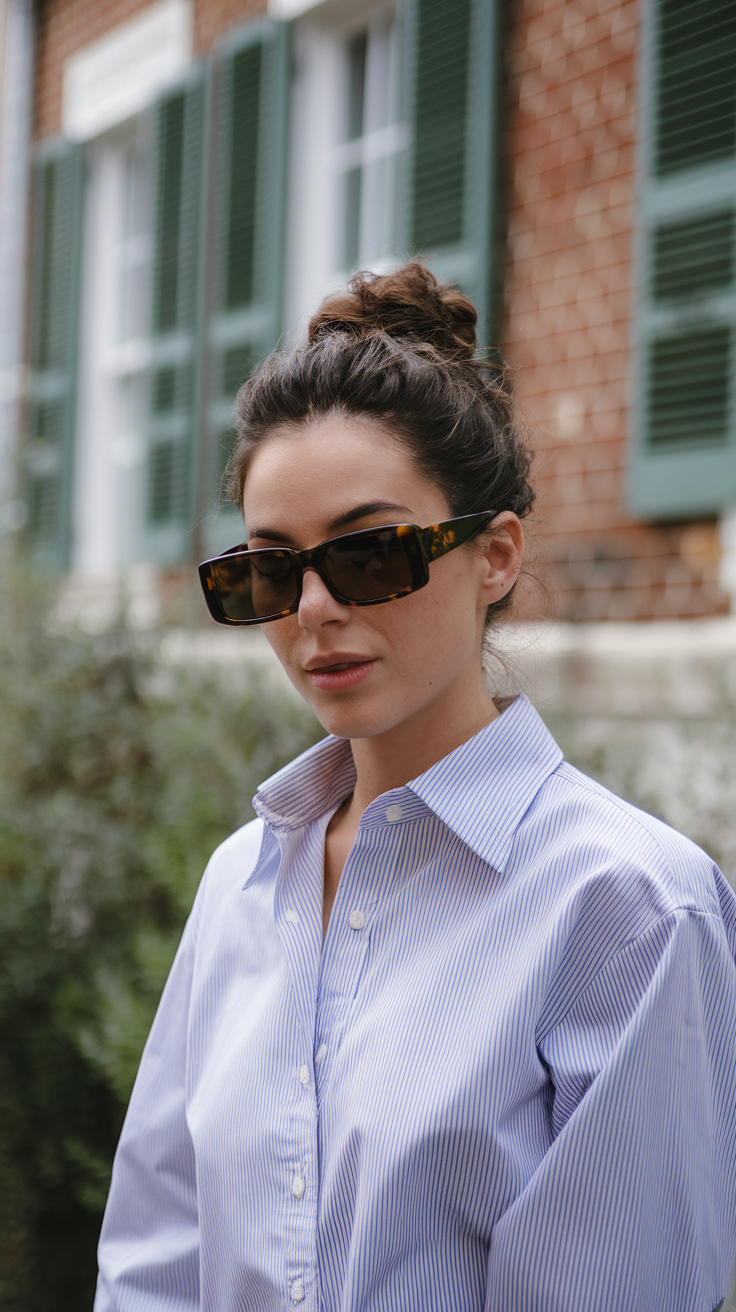 Slim rectangle sunglasses are the definition of effortless cool. They add that instant “I didn’t try, but I look amazing” vibe to any outfit — from tailored trousers to oversized blazers.