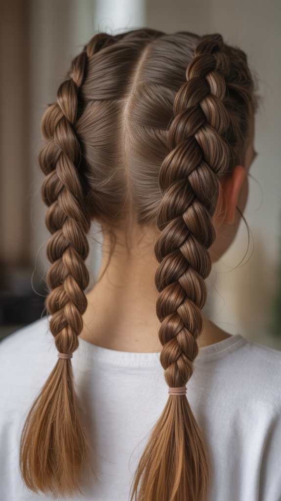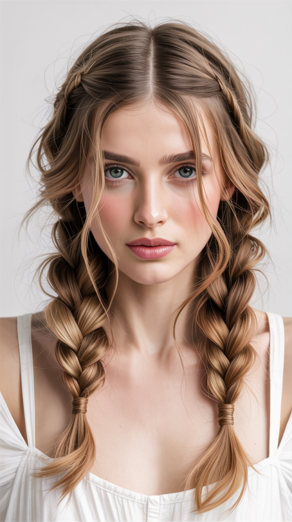 Clean middle part, loose braids, ends left a bit messy. Cute and cool—literally.