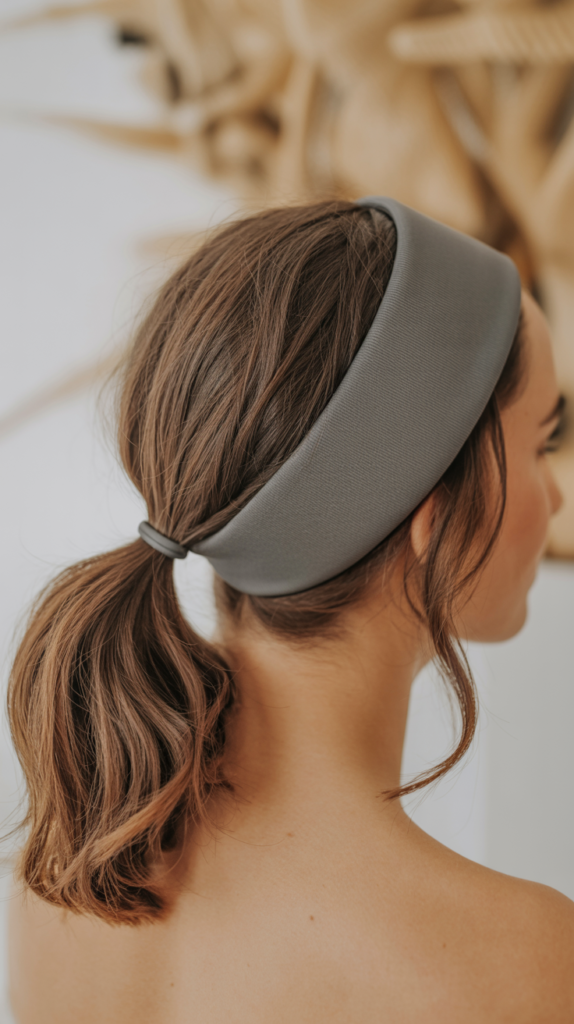 - Slip on a wide, non-slip headband over a low pony or bun.