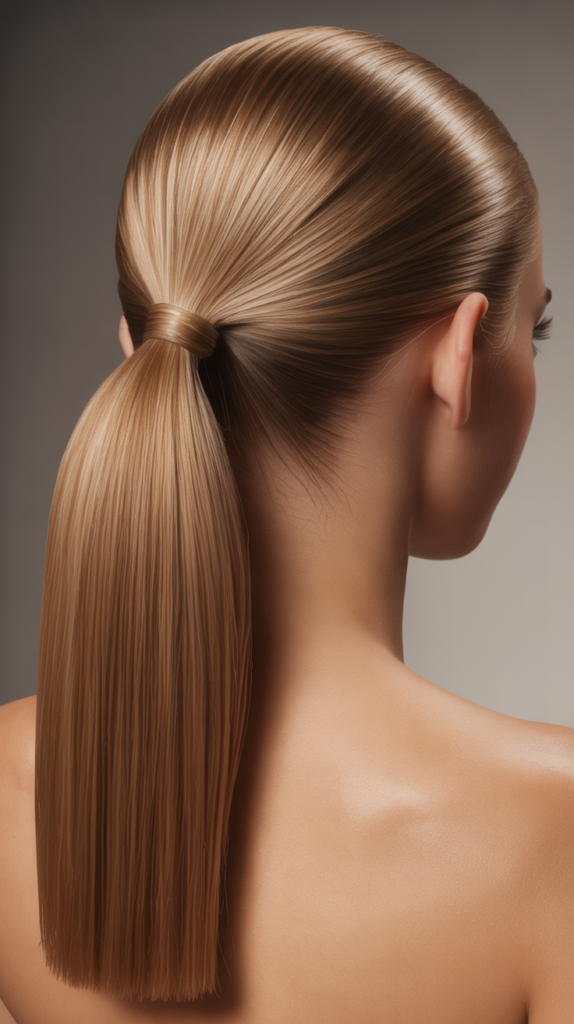- Brush into a low pony at the nape. Secure tight but not headache-tight.
